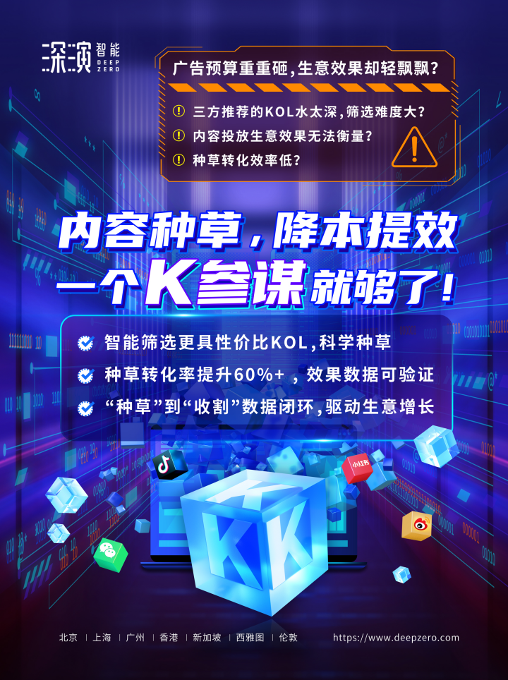 PA视讯智能K参谋科学前选,可跨领域找到最能影响品牌目标TA人群的KOL进行投放,同时有效平衡投资回报率;内容营销数据可同电商后链路平台打通,进行数据归因分析,准确判断KOL影响的用户是否真实在电商平台产生购买行为;实现“种草”到“收割”链路闭环,轻松内容营销,可根据品牌方的业务需求提供一站式的KOL采买及数据验证服务,有利提升整体内容营销的效率与效果。